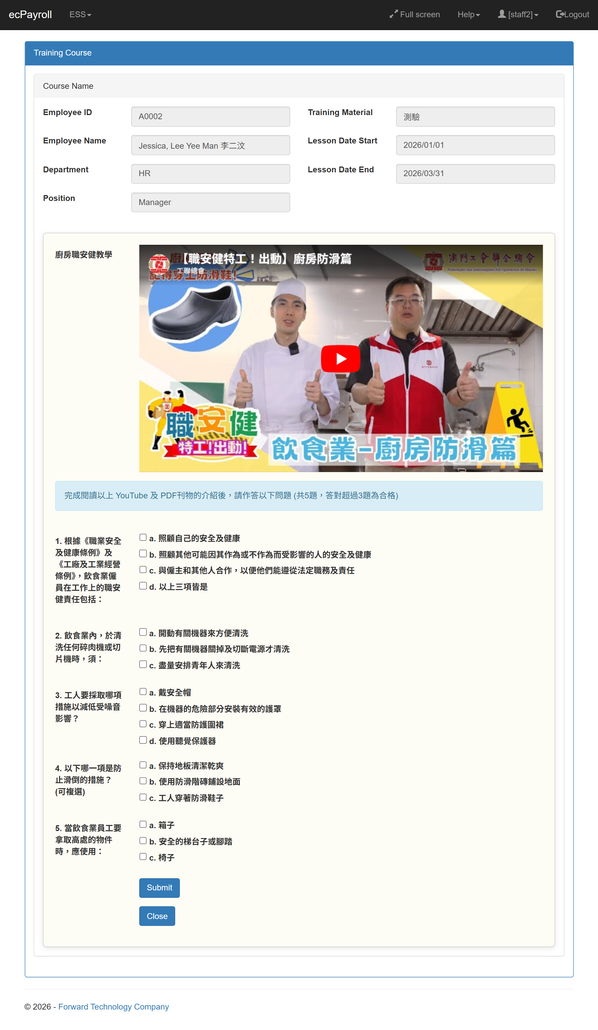 A new Training Material Form module is now available. This module works with the existing training courses and allows admin users to create multiple forms for staff to complete their training online. Staff can learn on the web by watching YouTube videos, reading PDF articles, and completing quizzes to pass the assessment. The quiz form supports multiple‑choice questions defined by the admin user, including the correct answers. Once the form is submitted, the system automatically checks the responses. If the number of correct answers meets or exceeds the minimum passing requirement, the quiz is marked as passed. This enables staff to complete their training anytime and anywhere through the web. 全新的 培訓教材表單模組 已經推出。此模組可與現有的培訓課程配合使用,讓系統管理員建立多份表單,供員工在線上完成培訓。員工可透過網頁觀看 YouTube 影片、閱讀 PDF 文章,以及完成測驗以通過評核。 測驗表單支援由管理員設定的 多項選擇題,並可定義正確答案。當員工提交表單後,系統會自動批改答案。如果答對的題數達到或超過最低合格要求,測驗即視為通過。 此功能讓員工能夠 隨時隨地 透過網頁完成培訓。 |