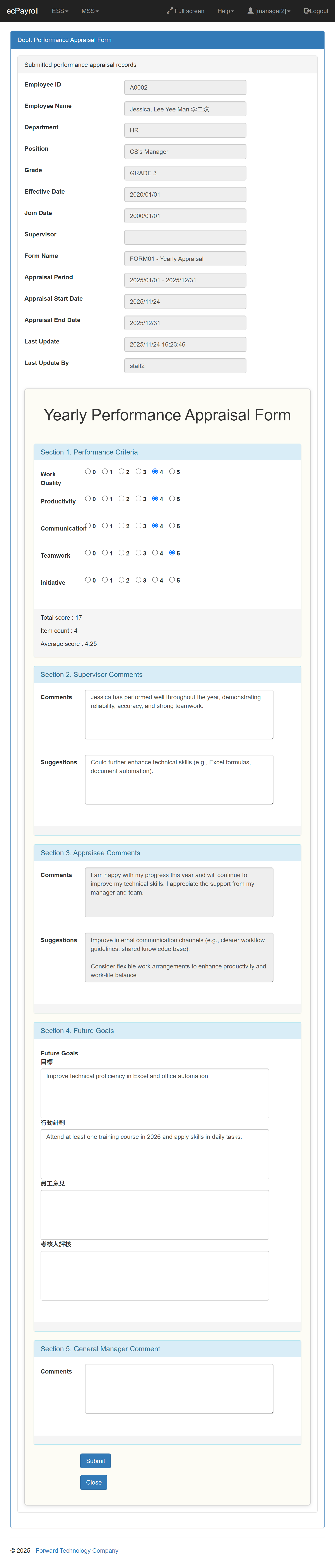 A new Performance Appraisal module is now available. It includes a Form Builder, allowing admin users to create and customize their own appraisal forms. Each form can contain an unlimited number of items. In addition to the standard item types supported by the Form Builder, a special appraisal rating item is available, where score levels can be defined. The system will automatically calculate the total and average scores. Workflow control is also supported. Admin users can define the form‑filling sequence, and once a form is submitted, the system will notify the next person by email. All completed appraisal forms are stored in the system backend, allowing HR to retrieve them at any time. This represents a significant step toward replacing traditional paper‑based appraisal forms with a fully digital e‑appraisal process. 全新的 績效評核模組 已經推出。此模組內建 表單產生器(Form Builder),讓系統管理員可自行建立及自訂評核表。每份評核表可加入不限數量的項目。 除了表單產生器所支援的標準項目類型外,系統亦提供 專用的評分項目,可自訂評分級別。系統會自動計算 總分 及 平均分。 系統同時支援 流程控制(Workflow Control)。管理員可設定表單填寫流程,當使用者提交表單後,系統會自動以電郵通知下一位負責人。所有已完成的評核表都會儲存在系統後台,讓人力資源部可隨時查閱。 這項功能代表著從傳統紙本評核,邁向全面電子化 e-Appraisal 的重要一步。 |