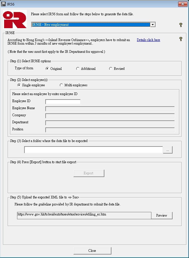 Following the IRD specification update released in August 2025, ecPayroll now supports XML export for IR56E and IR56G, in addition to IR56B, IR56F, and IR56M. This enhancement enables users to submit all IR56 tax forms electronically via the e-Tax platform, reducing reliance on printed documents. 根據稅務局於2025年8月發佈的規格更新,ecPayroll人事管理系統現已支援以XML格式匯出IR56E及IR56G稅表,繼IR56B、IR56F及IR56M後進一步完善功能。此改善讓用戶可透過電子報稅平台提交所有IR56表格,減少使用紙本文件。 |