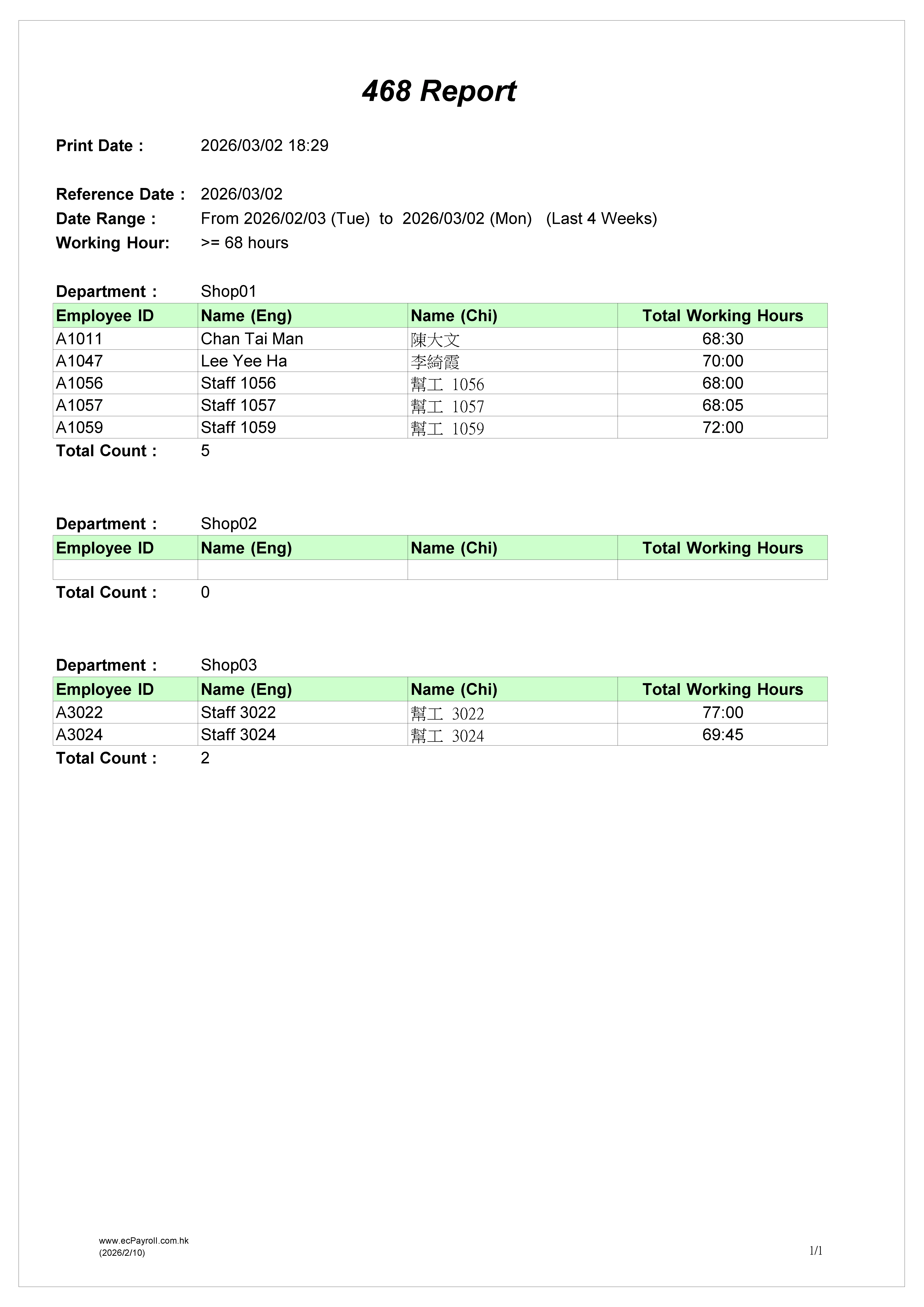 The “468 Report” is now available. Users can select N weeks and M working hours to filter out all employees whose working hours meet the specified criteria. This allows users to identify employees who already fulfill the 468 ordinance as well as those who have not yet met the required conditions. 全新的 「468 報表」 已經推出。使用者可以選擇 N 個星期 及 M 個工作時數 作為篩選條件,用以找出所有工作時數符合指定標準的員工。此功能可協助使用者辨識哪些員工已符合 468 條例 的要求,以及哪些員工尚未達到相關條件。 |