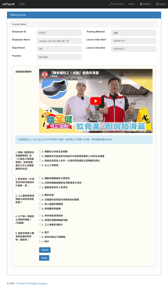 配合現有的培訓課程模組,讓員工透過網頁觀看 YouTube 影片、閱讀 PDF 文章,以及完成測驗以通過評核。 測驗表單支援由管理員設定的 多項選擇題,並可定義正確答案。當員工提交表單後,系統會自動批改答案。如果答對的題數達到或超過最低合格要求,測驗即視為通過。 此功能讓員工能夠 隨時隨地 透過網頁完成培訓。
