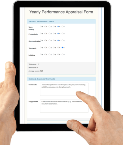 支援表格建置模組,員工及上司可透過網上 ESS / MSS 填寫已設定好的Performance Appraisal表格,免除列印表格,人事部輕鬆之餘又環保。已儲存的Appraisal form更可隨時查閱。