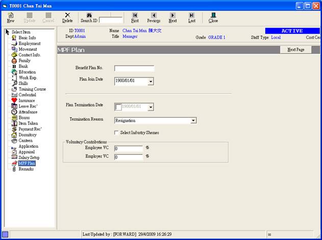 For the calculation method “Individual VC%” and “MC+ Individual VC%”, please input the “Voluntary Contribution %” in screen “Employee Setup” > “MPF Plan” for each employee.