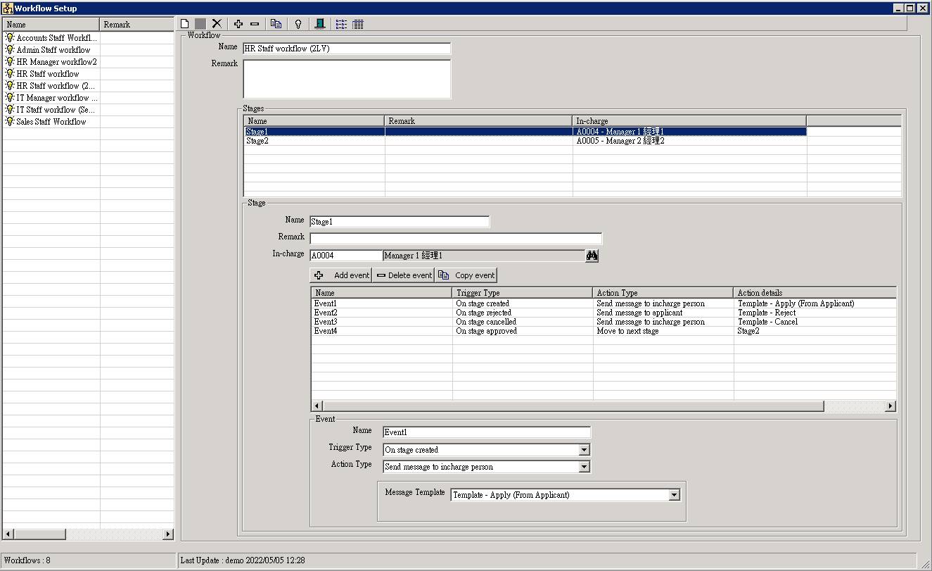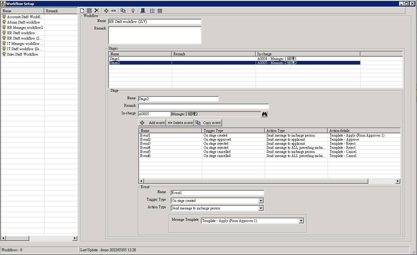 Below is the example of the “workflow” which have 2 stages ( 2 in-charge person)